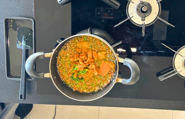 下茹で(蒸し)してたり、途中から火を入れているので煮込みの時間は10分程度。見た目や食感を考えると、煮込みすぎてどろどろにならない方がいいです。