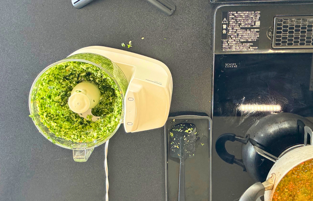 最後に、小松菜とキャベツをフードプロセッサーで細かくカットし、お鍋に投入します。