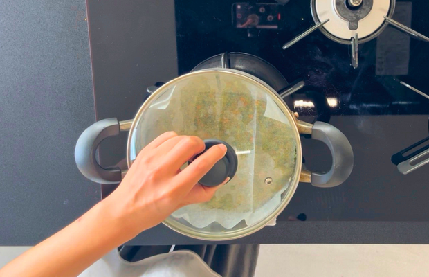 小松菜から灰汁が出るので、落し蓋(私の場合はクッキングシートに穴を開けたもの)をし、その上からお鍋の蓋をしてごく弱火のまま10分放置します。