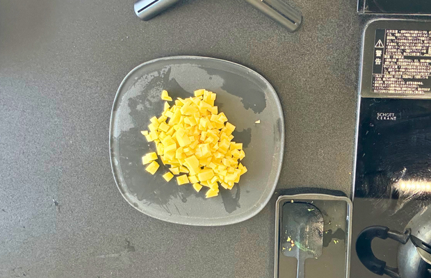 かぼちゃとブロッコリーをレンチンしている間に、じゃがいもを7mm角程度のさいの目にカットします。
